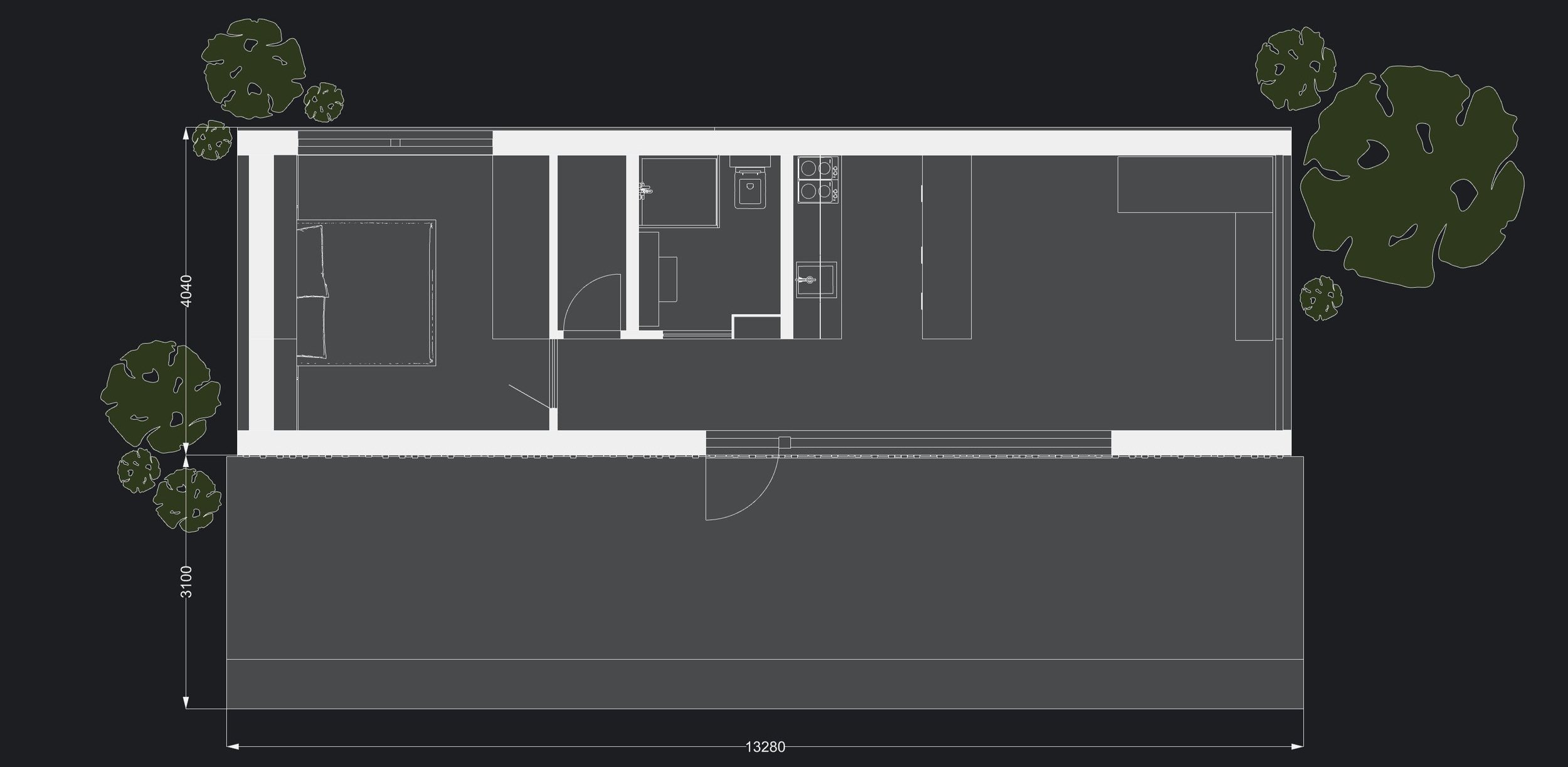 The living space integrates the living area with a well-equipped kitchen, creating a multifunctional center where the emphasis is on the practical use of every square centimeter. The bathroom, combined with a toilet and shower, offers both efficiency and comfort. The module also has a technical room, allowing for easy maintenance and management of the space. The bedroom, with a large window, provides plenty of natural light and an atmosphere ideal for rest and regeneration. The connecting corridor with large glass panels provides sufficient natural light.